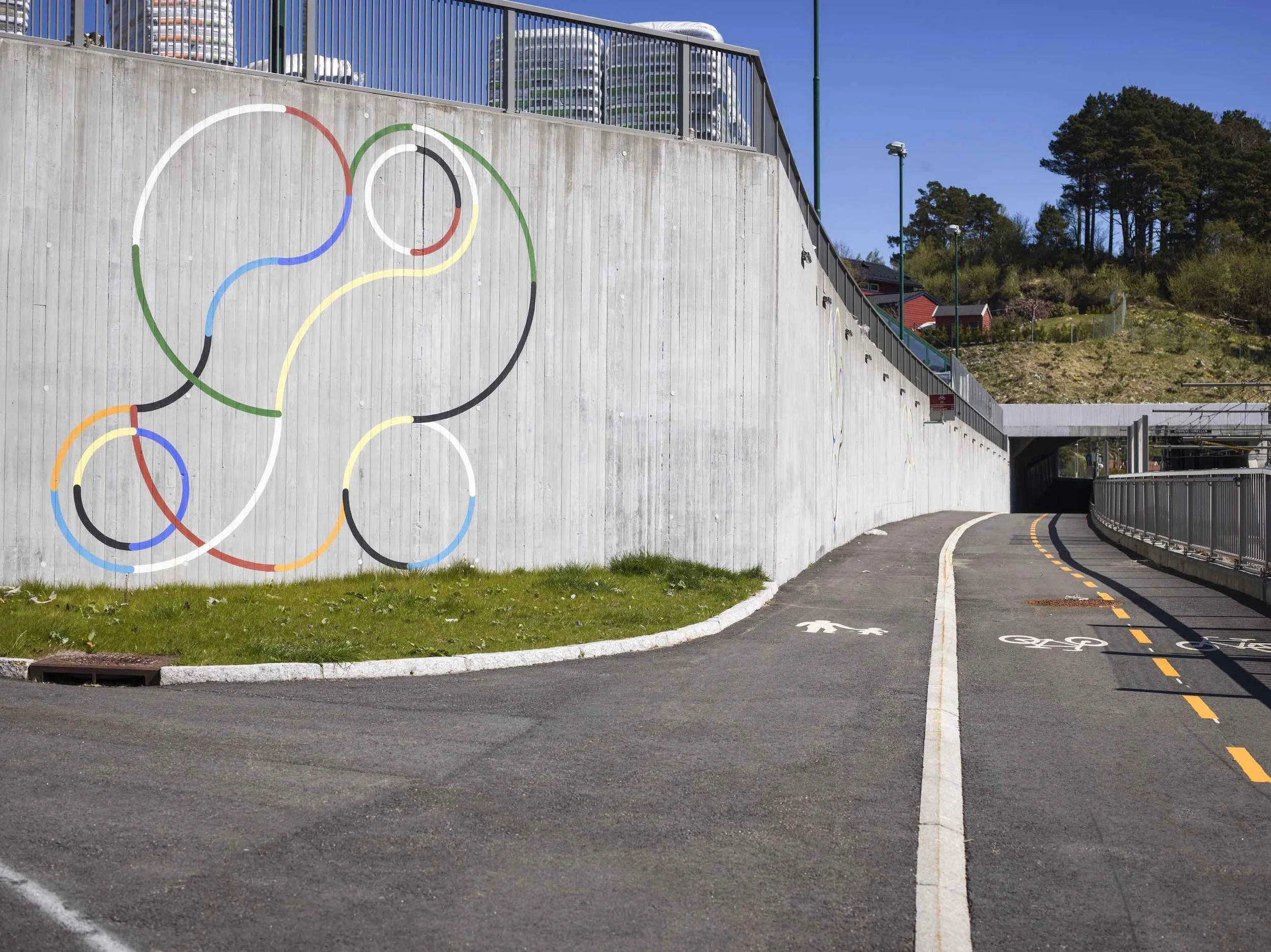 Bergen bybane, ved Sandslimarka stasjon 2014 - 16. Silikatmaling på betong. Foto Morten Wanvik.